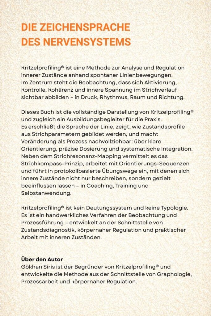 Kritzelprofiling® setzt genau dort an. Die Methode nimmt ernst, dass das Nervensystem eine Sprache spricht, die älter ist als unsere Erklärungen. Diese Sprache besteht aus Spannung und Entlastung, aus Beschleunigung und Bremse, aus Raumgefühl und Enge, aus Rhythmus und Unterbrechung. Sichtbar wird sie in einer Spur, die man nicht erfinden muss, weil sie ohnehin entsteht: auf Papier.
