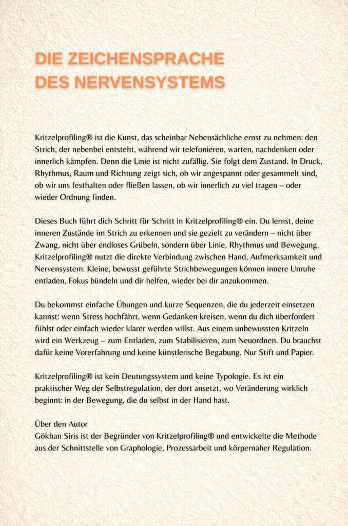 Kritzelprofiling® braucht keine App, keine Technik, keine Inszenierung. Stift und Papier reichen. Und genau das ist seine Stärke in einer Zeit, in der viele Menschen an zu viel Input ermüden. Es ist kein weiterer Reiz, sondern Reduktion. Ein stiller Raum, in dem das Nervensystem nicht reagieren muss, sondern führen darf.